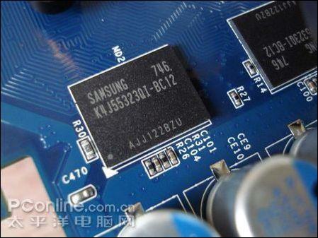 影驰 9600GT少将版载三星编号为K4J55323QI-BC12的1.2ns GDDR3显存,单颗规格256M/32bit,共八颗组成256M/256bit显存规格,相较上一代8600GT有了显存带位宽有了非常明显的提升,显存带宽可达57.6G/s,核心/显存/流处理器频率为650/1800/1625MHz