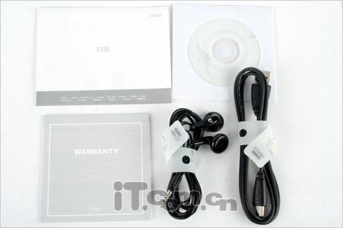一改以前保守的包装,这次iriver E100的包装采用了类似苹果nano系列的全透明包装,使用户第一眼就能对iriver E100外观有详细的了解,整体风格配色也非常清新。而包装内的配件很简洁,包括USB数据线、耳机、软件光盘和保修卡、简明使用指南等。值得一提的是,此处绑定耳机线和USB线的束线器相当精致。