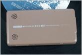 机身背面设计也非常独特,首先是上方左右对称排列的两个扬声器。中间横贯的文字主要机器型号、容量以及通过的认证等信息,可以看到机器的产地为中国。