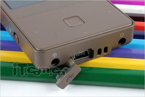 机身左侧主要为上方的RESET孔和下方的HOLD推键,推键为圆形设计,较为少见。机身右侧从上到下依次为音量增减键、内置麦克风口和开关机键。机身顶部为外接micro SD卡的插槽,闪存型E100有2GB/4GB/8GB三种容量,支持最大8GB Micro SD卡拓展。插槽有与机身相连的橡胶片保护,同时在开启处还预留了开启位,相当贴心。机身底部则为LINE-IN直录接口,同样由橡胶片保护、带开启位的标准mini USB接口和标准的3.5mm耳塞接口。
