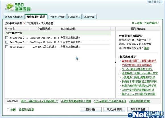 360安全卫士:通过检测,这款软件共检测到9个安全漏洞,其中包括5个系统安全漏洞、2个Office安全漏洞和2个应用软件的安全漏洞,不过2个应用软件的安全漏洞采用了另页显示的方式(如图10、图11)。
