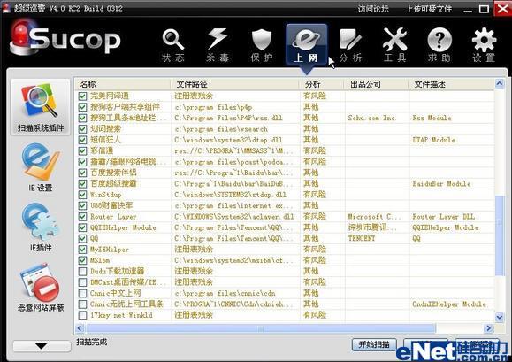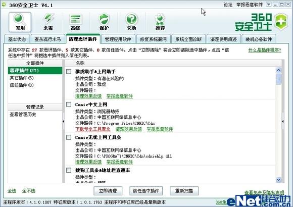 清理流氓软件也是“超级巡警”和“360安全卫士”的强项之一,其实“360安全卫士”就是从流氓软件清理开始起家的。