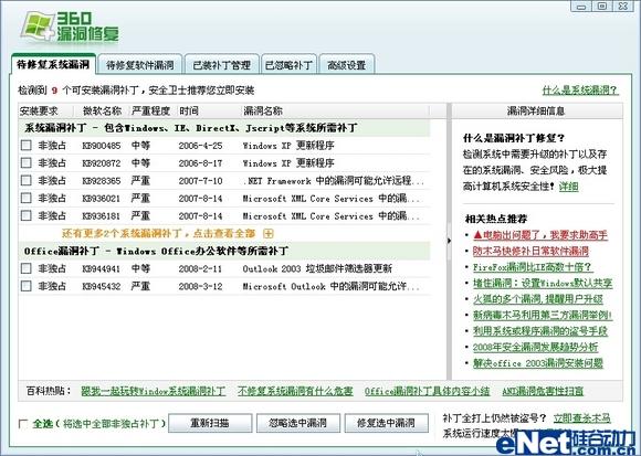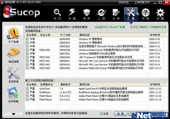 “超级巡警”和“360安全卫士”都提供了系统安全漏洞的自动修复功能,即自动检测系统中已经存在的所有安全漏洞,并且会根据漏洞情况自动下载和安装对应的最新安全补丁,所以软件的这项功能可以说都是非常实用的。