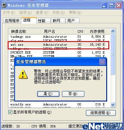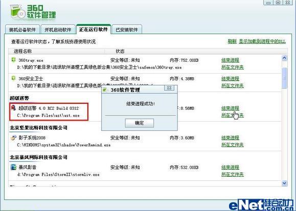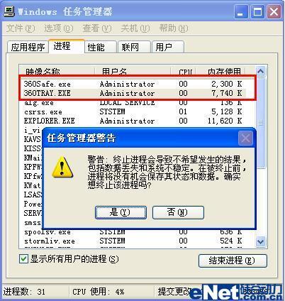 接着笔者同时再次打开这两款软件的实时监控功能,然后分别使用它们各自的“进程管理器”功能来彼此“结束”对方的对应进程,结果对方进程全部得到“中止”。至此,这两款软件实时监控的“自我保护”功能宣告失败(如图7、图8)。