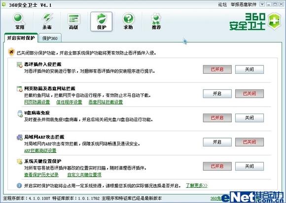 360安全卫士:同样在软件主界面的“保护”面板,软件按照“恶评插件入侵拦截”、“网页防漏及恶意网站拦截”、“U盘病毒免疫”、“局域网ARP攻击拦截”和“系统关键位置保护”等也提供了5个安全监控项目,用户同样可以开启其中的部分或全部监控选项(如图4)。