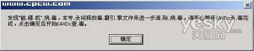 运行金山的“磁碟机”病毒专杀工具,程序提示“发现磁碟机病毒,本专杀将释放毒霸引擎文件来进一步清除病毒,请耐心等待KAVDx杀毒完成”(图1)。为了防止病毒对专杀工具进行屏蔽,提示中的内容都是进行特别处理的。