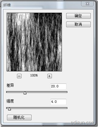 第三步:选择白色图层,点击滤镜-渲染-纤维,按照图片的参数设置。(差异20,强度4)。