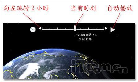 要启动Google Earth的“日夜模式”并不复杂,我们只要点击一下顶端工具栏中的“日光”按钮即可。稍后,屏幕顶端会马上弹出一个“时间刻度”,而Google Earth则会根据这个时间,自动计算出当前的阳光角度与强度。最后,一个包含着日夜模式的“地球”,便呈现在了我们面前。而这,与宇航员们在太空中所见的真实地球,可是完全一样的哟!