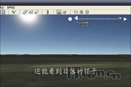 【小提示】 除此之外,笔者还要告诉你一个小技巧。当我们使用鼠标右键,在地图上向下移动时。Google Earth会在接触“地面”的一刹那,将“俯冲”模式更改为“平飞”。如果此时,我们再启动新版本的“日夜显示”功能(下文将介绍),猜猜您会看到什么?呵呵,竟然是日出和日落,如图2所示。