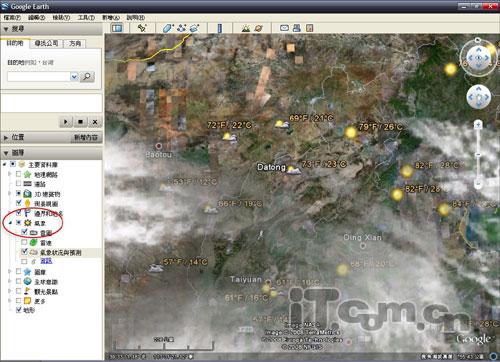 细心的朋友应该已经发现,在前面几张截图中,漂亮的地球都被覆盖了层层云朵。其实,这也是Google Earth的一项新功能 —— 天气图层。和街景一样,当我们在图层栏中勾选“Weather”(气象)一项,便成功地启用了这一功能。值得一提的是,和Google Earth的很多图层一样,“Weather”图层也包含着若干子图层。平时,当我们勾选“Clouds(云层)”和“Conditions and Forecasts(气象预测)”之后,就可以在卫星地图上,看到实时的云图和温度了。至于剩下两项,“Radar(多普勒雷达图)”和“Information(信息栏)”,对于我们普通人来说,用处就不是很大了,如图7所示。