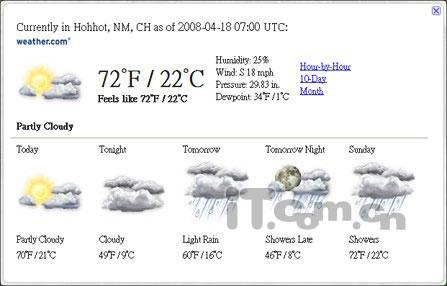 【小提示】 除此之外,当我们用鼠标点击地图上的温度图标时。Google Earth还会通过一个小窗口,向我们报告出目的地,最近五日的天气预报,非常方便,如图8所示。