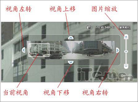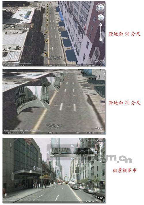 和Google map中的街景视图一样,Google Earth同样允许我们通过操作杆,对当前画面进行“拉伸”和“旋转”。不过,令人感到遗憾的是,在Google Earth中,我们并没有看到原本出现在Google Map街景中,那个颇具特色的指示路标。而且,和Google Map相比,Google Earth的前后街景切换画面,也大不如以前顺畅,如图6所示。