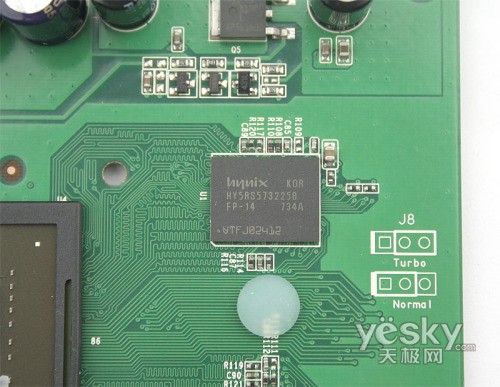 显存方面搭载的是hynix GDDR3高速显存,速度1.4ns,默认运行频率1200MHz,版载64M容量,并通过TurboCache技术动态扩展到256M容量显存,3D性能进一步提高。