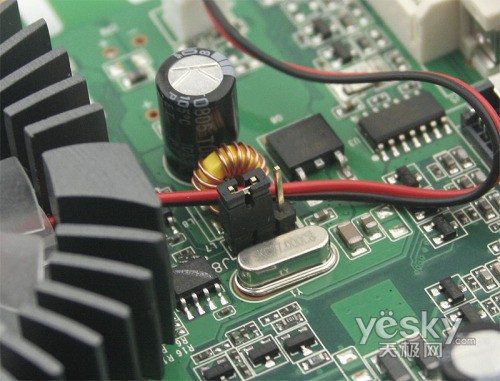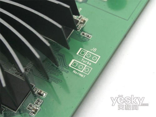 由于使用了规格更高G84核心,因此寒龙SY8486GS神奇跳线-TC256M在卡上特别设计了一组神奇跳线,通过跳线设置,能够能够让显卡运行在更高的频率下,获得更好的性能。在普通运行模式下,显卡核心工作频率为460MHz,shader频率918MHz;只要将跳线设置为Turbo模式,显卡立刻变成8600GT,核心频率高打600MHz,shader频率达到1200MHz,大幅提升频率带来的直接效果就是游戏性能更强。