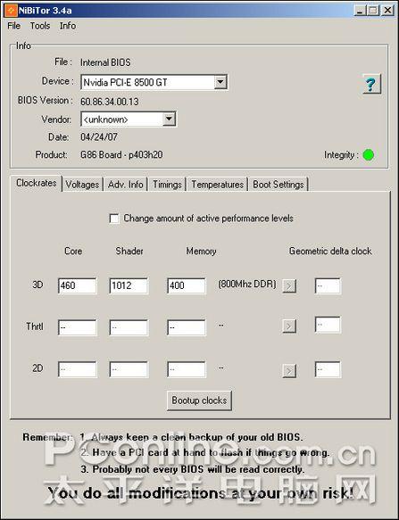 MVKTech 所推出的nVIDIA BIOS编辑软件——NiBiTor,可以说是目前最好的nVIDIA显卡BIOS编辑工具之一。通过NiBiTor,用户可以打开显卡的隐藏属性,并提高显卡的稳定性和实际性能。它操作界面相当人性化,并且功能强大,即使是以前没有接触过此类工具的朋友也能很快上手,更为重要的一点就是,它的更新速度相当迅速,每当新型号显卡推出不久,它就会推出相应的版本,以便用户更好的使用。