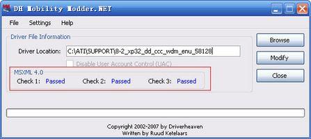 2、运行“H Mobility Modder.NET”,浏览到“C:/ATI/SUPPORT”文件夹里的Driver文件夹,比如催化剂8.2的“C:\ATI\SUPPORT\8-2_xp32_dd_ccc_wdm_enu_558128”,然后点击“Modify”按钮,等待驱动修改完成。