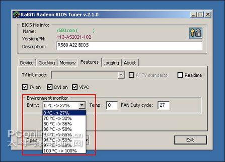 4.支持自动温控功能,可以给显示核心设置一个最高的温度上限,如果当超频后显卡的核心温度高于此预设值时,将会自动关闭显示核心,以保护硬件不受损坏。