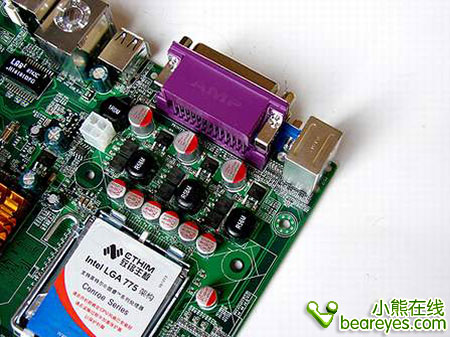 供电部分,三相回路设计,采用了富士通全固态电容、全封闭电感和一上二下的MOS管设计,保持产品的稳定性。除板载显示核心外,为获取更强的显示性能,它还提供了独立的PCI-E x16显卡插槽,可以外接独立显卡。功能部分,它采用AL662声卡芯片,支持HDA音频标准,同时整合了RTL8101网络芯片,支持自适应10/100Mbps网络连接。目前售价399元。本站商场相关产品链接
