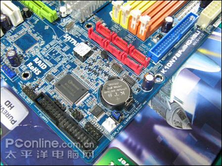 SB700南桥一共提供了6个SATA 3.0Gb/s接口,并且支持多种SATA RAID磁盘阵列功能。由于技嘉 GA-MA78GM-S2H将其中一个设计到主板的背部接口上面作为eSATA使用,故南桥附近仅有5个SATA接口供用户连接内部设备。