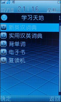 在步步高i188主菜单的“工作娱乐”中,拥有学习天地、轻松一刻、常用工具以及JAVA四个大选项。对于正在学习英语的用户来说,步步高i188手机提供了包括英汉/汉英词典、初中至考研词汇以及阅读等在内的一整套学习方案,从各个角度突击你的英语水平。而且单词背诵和词典都具有发声功能,生动的语音记忆方式效果更佳。同时,复读机功能也能训练你的听说及口语能力。