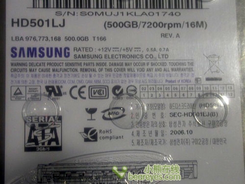 三星 HD501LJ/CNG(金宝)容量为500GB,转速为7200RPM,缓存为16MB,支持NCQ技术。在硬盘的下方,我们可以看到“此硬盘专为中国市场设计开发,经三星指定正规渠道销售,故能得到正式售后维修服务”的字样,由于市场上有不法商家以水货冒充行货销售,所以三星也特意声明,为了保障广大消费者的权益。