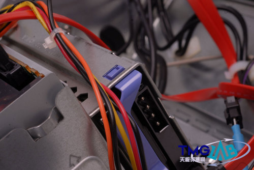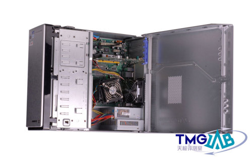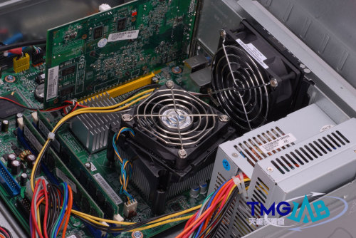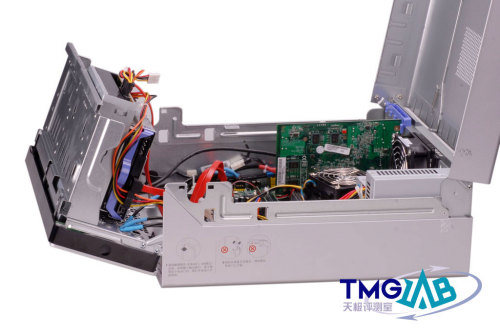 IdeaCentre Q采用的这种免工具拆卸设计已经非常成熟,各部份的模块分离比较清晰,走线和布局都十分整齐。内部除了处理器风扇之外,还设计有一个机身风扇协助散热。