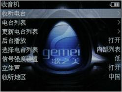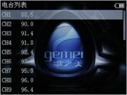 歌美X100没有省略较为常用的FM收音功能,而且将子菜单功能做得更加详细,支持电台列表,用户可以直接选取已存储的电台;支持后台播放、信号强度以及立体声设置;收音地区则提供了中国、欧洲、美国以及日本四种。实际的收音效果还算不错,评测人员所在的广州地区利用自动搜台模式可以搜到10来个电台,个别受移动的干扰较大。