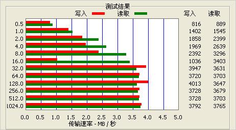 USB速度方面,评测人选用ATTO Disk Benchmarks软件进行测试,结果如下,从截图可以看出,歌美X100的最快读取速度为4012kbps,最快写入速度为3765kbps,这样的速度属于正常水平。