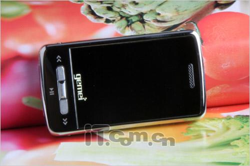 歌美X100的外观平实而又不缺乏时尚,整机各个面都采用了镜面设计,反光效果良好,当镜子使用的效果也相当不错,当然也带来容易流行指纹的缺点。正面上方为镜面面板,因此看不出屏幕的边框,最顶上设计了内置喇叭的发音孔,屏幕下方则是歌美的英文logo以及分别控制前进、后退、播放/暂停的三个按键。使用时,机器为横向显示,按键位于右侧,方便右手操作。