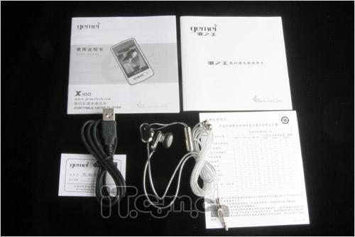 歌美X100的配件包括说明书、保修卡、合格证、USB数据线以及耳塞等,配件不算丰富,只能说是标配了,没有配备充电器显得太吝啬。总的来说,歌美X100的外观设计和做工还是不错的,只是配件稍显简陋。