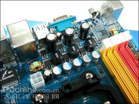 映泰 MCP6P-M2主板采用标准的三相供电设计,选用KZG电解电容和密封式电感,每相供电搭配2个MOSFET管,虽然并不算十分豪华,但足以保障系统的稳定性。