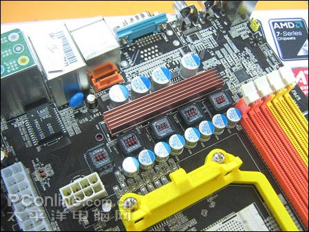 供电部分,盈通 A570X采用全固态电容、防磁密闭电感、高品质的MOS管,提供纯净的电流,保证主板的超频性能。