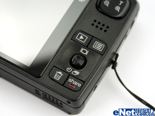 背部右侧的操控按钮设计简洁清晰,最上方为方块形状的变焦/缩放键,手型较大的男士可能会感到操作起来不是非常得心应手。而最常用的方向摇杆手感相当不错,在拍摄模式下可用它来进行连拍和定时的设定。回放、菜单、删除和Share键也让人一目了然。