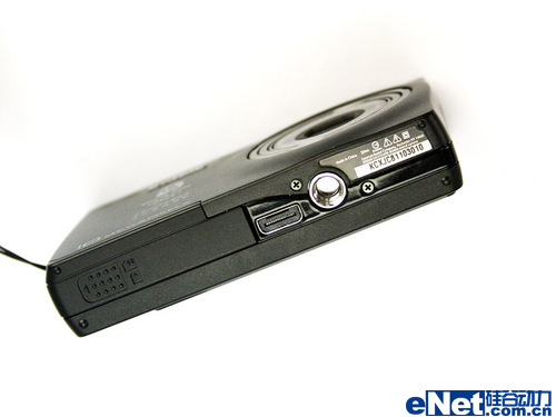 相机顶部的操作键从左至右依次是Mode模式选择、闪光灯开关、电源键和快门,在开机状态下,电源键会发出蓝色光晕。屏幕上方赫然印有HD标识,而电池和存储卡的安装位放置在了相机底部。