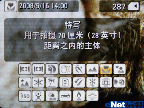 在场景模式的选择上,柯达M2008提供了多达22种场景,几乎覆盖了所有可能应用到的拍摄环境,其中包括全景照片、烟花、雪景、烛光、夕阳等比较特殊的场合,满足用户全方位的拍摄需要。