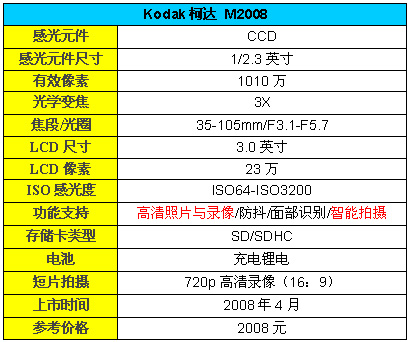 M2008是一款千万级像素的主流产品,CCD尺寸为1/2.3英寸,配备柯达自己的3倍光学变焦镜头,等效焦距35—105mm,最大光圈F3.1—F5.7,在核心配置上中规中矩。