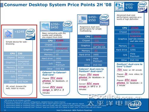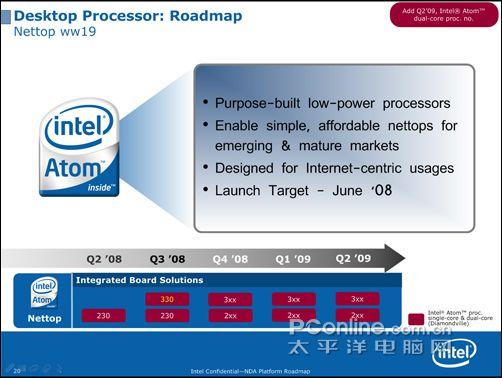 在Intel 最新的Roadmap中已经将Atom处理器列入到计划之中,但是这重要是针对08年后半年。由于Atom处理器自身定位以及收到产品性能的制约,因此在整个平台的搭建上Intel将其列为最廉价的入门平台之一,而且在芯片组以及应用范围上仅仅是都是处于入门级的定位。