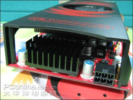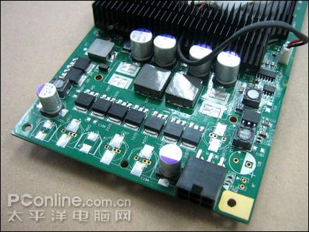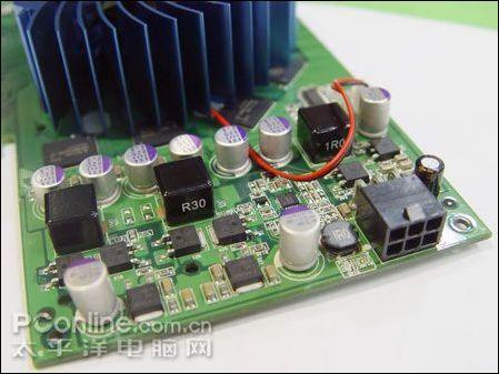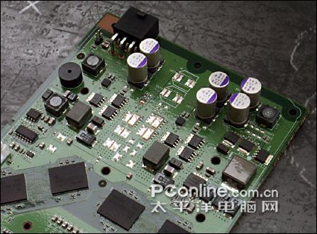 较高的核心规格对显卡的供电要求也,因此更高显卡配备了2+1相供电模块,核心拥有独立2相供电,而且每相供电配备多达3颗MOS管。由于使用了更多分流元件,电压更稳,保证电流的纯净,有效降低供电电路温度。整卡元件排列非常整齐,清一色采用三洋SEPC系列固态聚合物电容,搭配全封式陶瓷电感,能够带来更好的超频性以及稳定性。由于需要外接电源供电,如果用户忘记连接了6pin电源接口,显卡上集成的蜂鸣器将会发出警报声提升用户。