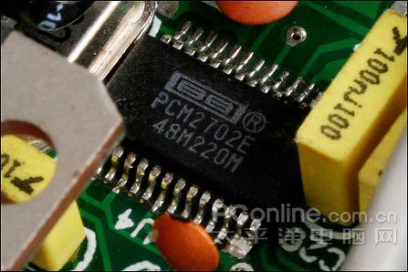 主芯片来自BB,型号为PCM2702E,这是一款基于USB界面的16bit数字→模拟专用解码芯片,它拥有较高的转换速率(12Mbps),信噪比高达105dB、THD+N:0.002%、输出电压能够达到3.1V。采样频率可支持32kHz、44.1kHz、48kHz三种模式。虽然功能简单,但是产品规格还是令人看好的。