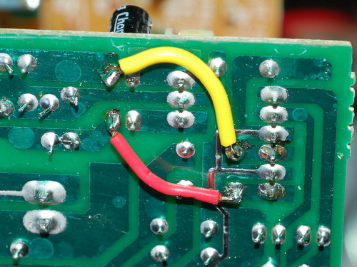 拔掉两块电路板间的连线后,再准备两根电线,长度约2-3厘米,分别焊在如上图所示的焊点即可,焊点在主功放电路板的左下角,就在拔掉连线的插座背面。焊接完成后,再次检查其它部分无误后,摩机即可暂时告一段落。先通电测试一下,注意先将音源的音量开到最小,两只音箱都正常出声后,即可将电路装回箱体,拧上背板螺丝。
