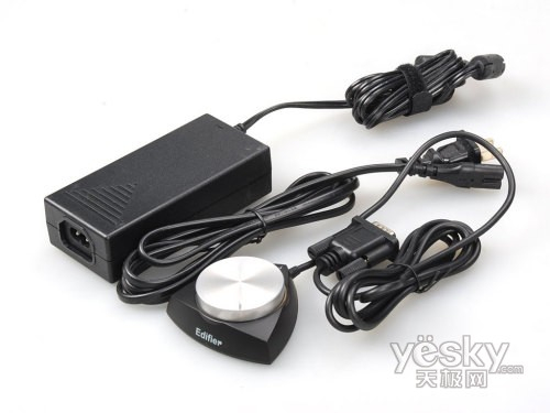 e3350的线控与漫步者S2.1M的线控非常相似,其操作手感不错,底部的橡胶垫加上内部添加了配重,放在桌面上很牢固。另外,e3350音箱采用了特殊的电源适配器。