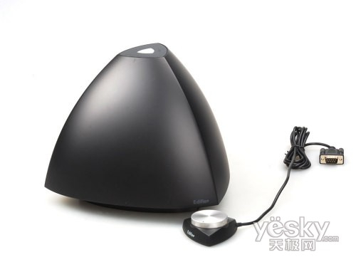 漫步者e3350的主箱造型酷似金字塔,可以看作是一个不规则状的三棱台,因为它的底部不是等边三角形,各个面也做了圆弧化设计。箱体表面采用黑色亚光喷涂工艺,比较容易留下指纹,所以经常擦拭是必须的。