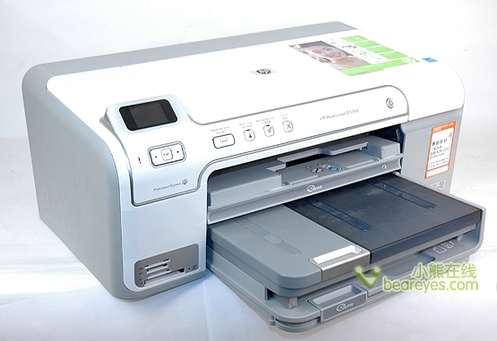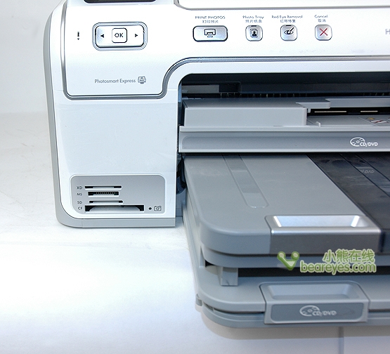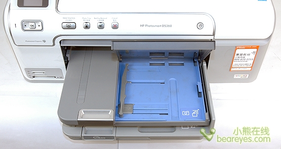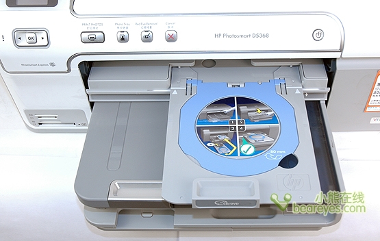 HP Photosmart D5368 在打印介质上范围很广,还可以支持光盘封面打印,专门的光盘打印托盘集成在“主纸盒”边框内,使用时需要抽出来安放在专门的光盘打印槽口。操作步骤都清晰地标示在槽口面板上,用户一看即知。