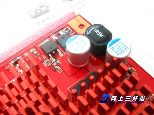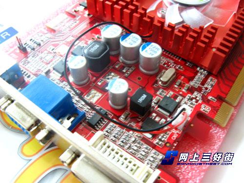 这款显卡的供电部分采用了分离式的设计,分别位于显卡的两侧,并且核心部分采用了两相供电设计,大量的精装铝壳电解电容,加上全封闭式电感和高品质MOSFIT配合,可以为核心和显存提供稳定纯净的电流。