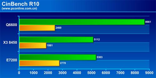 我们可以很明显的看到,CPU的理论成绩与核心的数量有很大的关系,9850也要落后Q6600,8450大幅度落后也是情理之中的事,不过根据8450的市场定位其竞争对手是E7200。此次评测虽然很多评测软件已经对多核心进行了优化,但是8450并没有与E7200拉开差距,除了架构方面的原因以外,似乎评测软件对三核心的挖掘并不是完全充分。小编会根据一些网友在论坛提出的意见,再进行一次 8450 VS E7200的多任务性能评测,真实反映两者在应用过程中多任务处理性能,敬请关注。