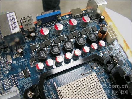 供电部分,采用了五相全固态供电电容加全封闭式电感线圈的组合,在整合产品中极为少见。相比起市场较为常见的4相供电780G产品,五相供电系统在AM2+ Phenom处理器上能有更稳定表现。