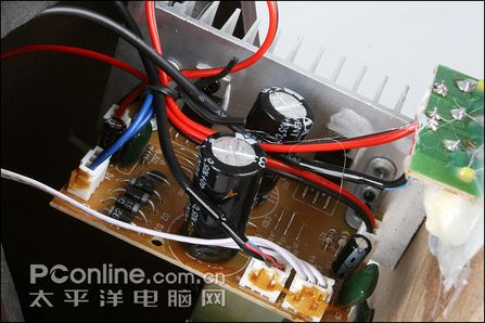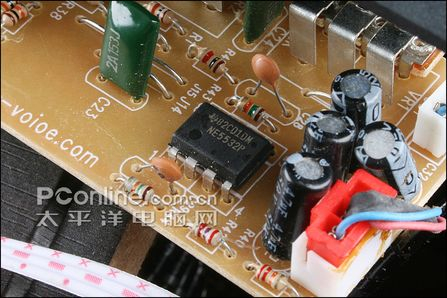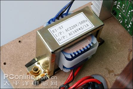 功放电路的另一侧,是一个小变压器,输出功率标称AC16V*2/1A,也就是说他能提供16w×2的额定功率。按照经典的HiFi理论,一般都是两倍的变压器功率提供一倍的最终输出功率。也就是说,平常使用时,变压器最好能留有50%的“余力”,以保证音频信号在大动态、大电平值放大时,不会造成较明显的失真。而在多媒体领域,其实大多数音箱都处于“吃不饱”的状态下,因此条件不妨放宽一些,可接受的输出功率范围应该在12w×2左右。