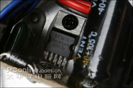 拆开箱体背面的电路板后,我们看到了后级功放电路,本来笔者以为前后级会放在一起的,这下看来是失算了——这是个比较简单标准的后级电路。电源经过稳压、滤波后给两颗台产1875供电,最终推动两个同轴单元。为何采用两颗1875呢?因为他是单声道的兼容芯片。