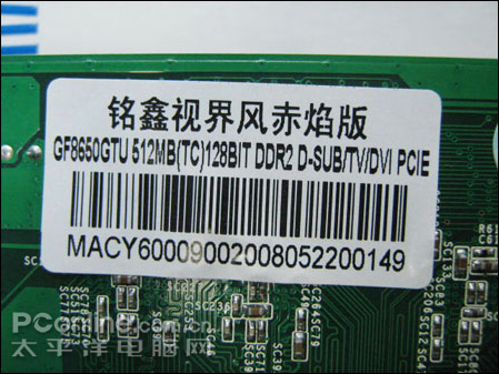 铭鑫 视界风赤焰版8650GTU-512D2TC采用奇梦达 2.0ns-GDDR2显存颗粒,通过Turbo Cache技术可以达到512MB显存,核心/显存默认频率为600/900MHz,流处理器频率为1600MHz。