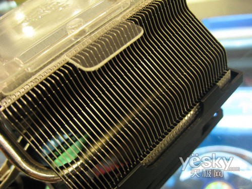 我们知道,散热鳍片的薄后程度决定了在同一散热器上采用散热鳍片的多少,上图可以看到,大黄蜂散热器采用了相当薄的散热鳍片,密密麻麻的散热鳍片间都有一定的间隙,这样的设计使得总散热面积进一步增大,散热效果达到最佳。